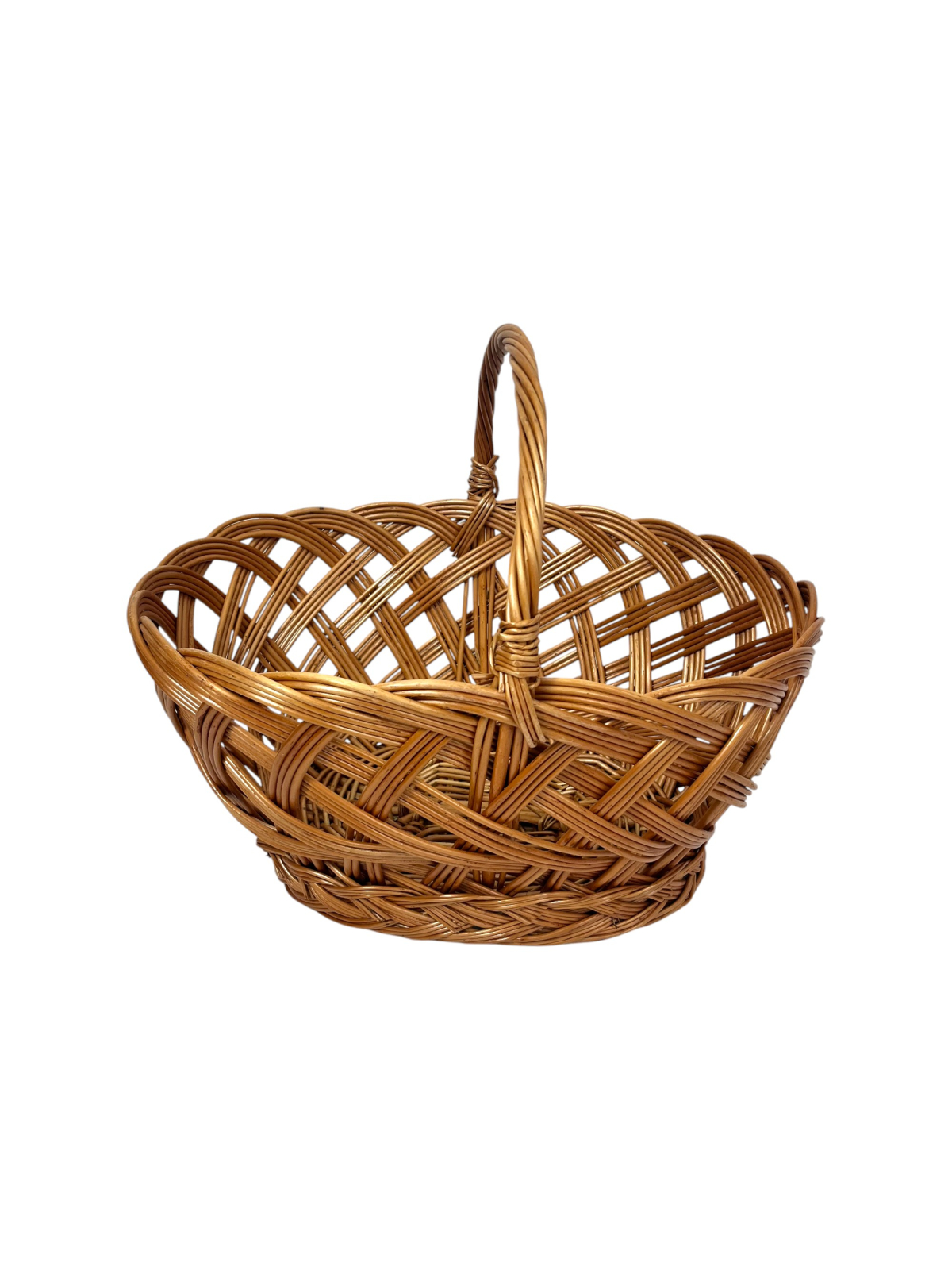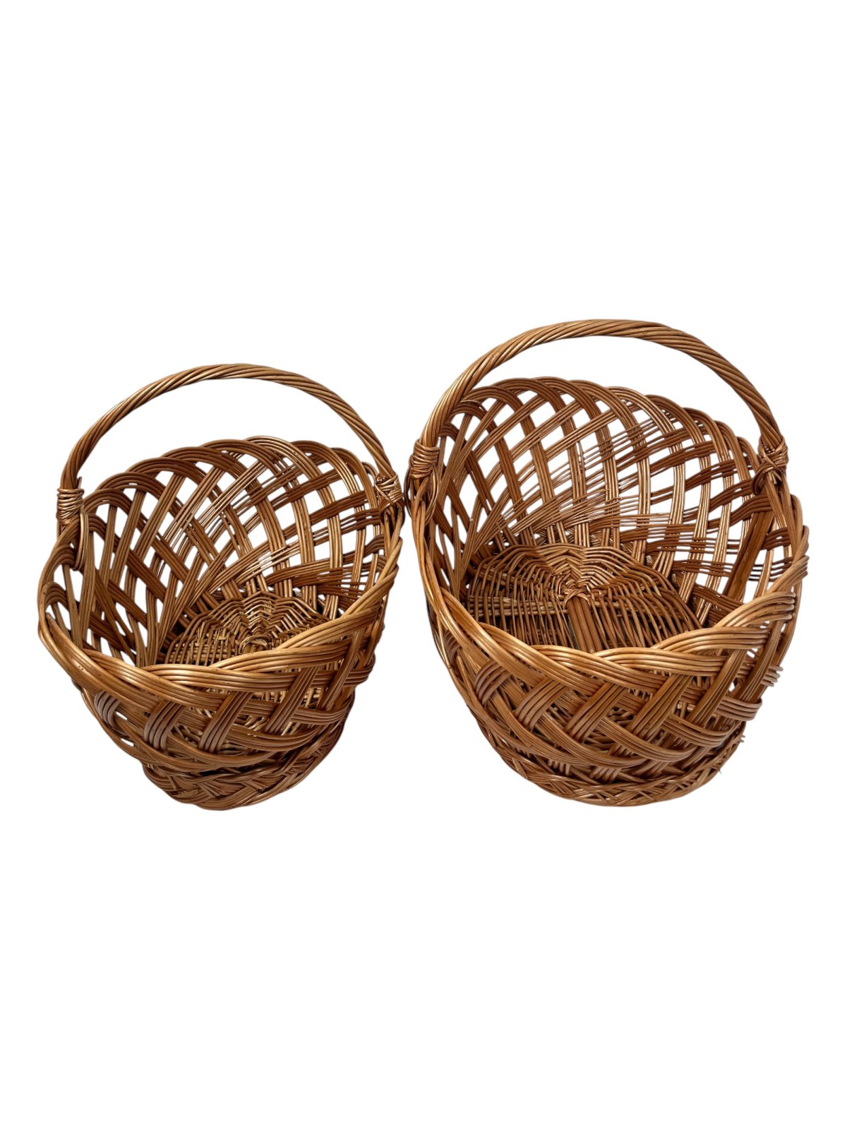 Set de două coșuri împletite manual din răchită naturală, realizate cu grijă și măiestrie artizanală. Coșurile sunt rezistente, ușoare și durabile, potrivite atât pentru mers la biserică, cât și pentru transportul sau depozitarea fructelor și legumelor.