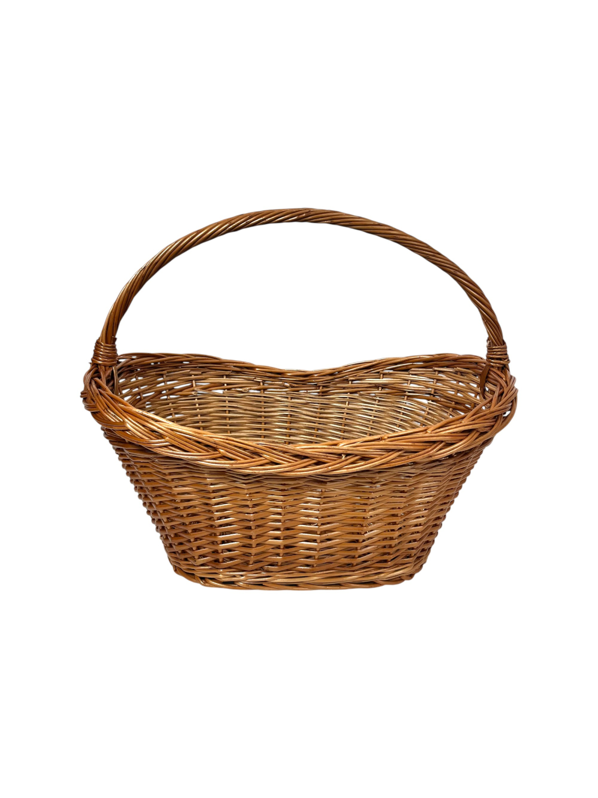Coș împletit manual din răchită naturală, realizat cu migală și pricepere artizanală. Este un accesoriu tradițional, practic și estetic, perfect pentru mers la biserică, transportarea sau depozitarea fructelor și legumelor, ori pentru oferirea de cadouri în perioada sărbătorilor.