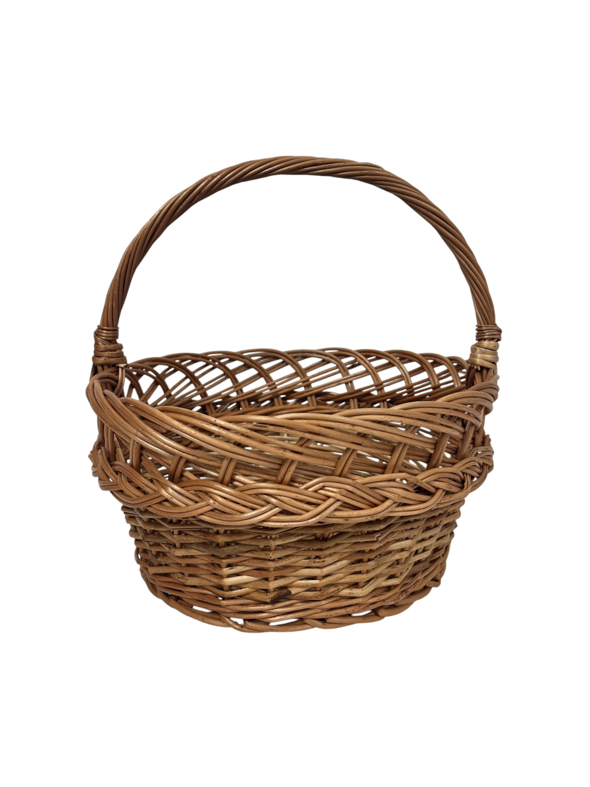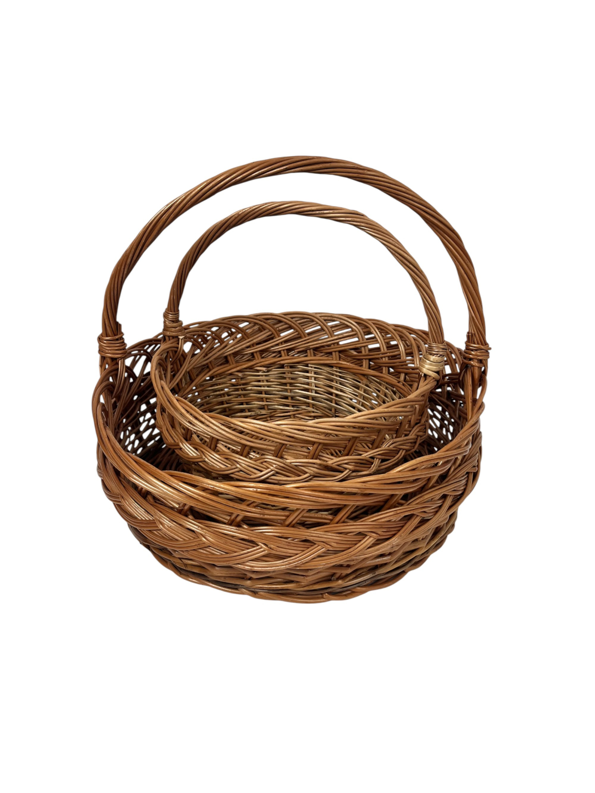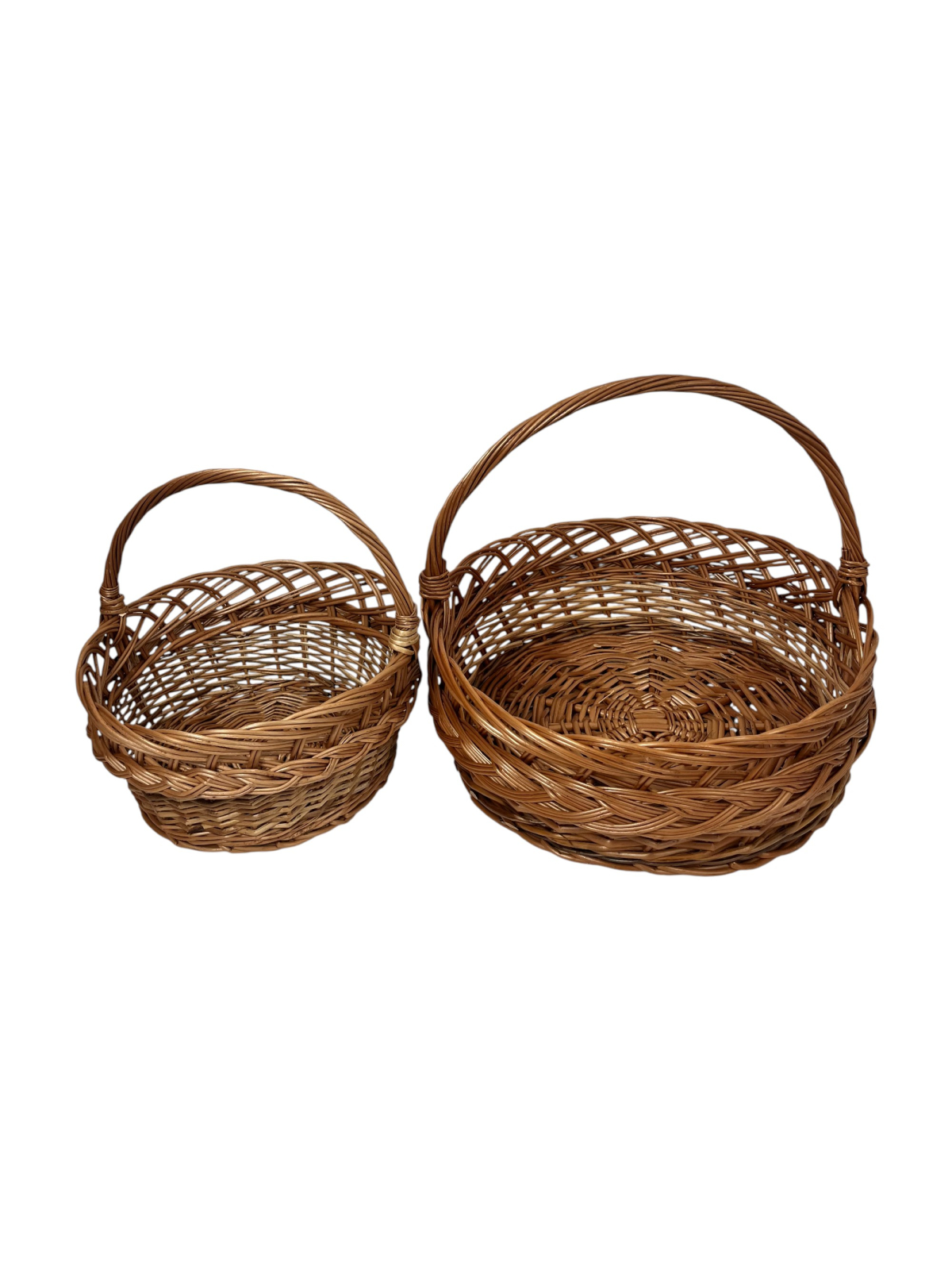 Set de două coșuri împletite manual din răchită naturală, realizate cu grijă și măiestrie artizanală. Coșurile sunt rezistente, ușoare și durabile, potrivite atât pentru mers la biserică, cât și pentru transportul sau depozitarea fructelor și legumelor.
